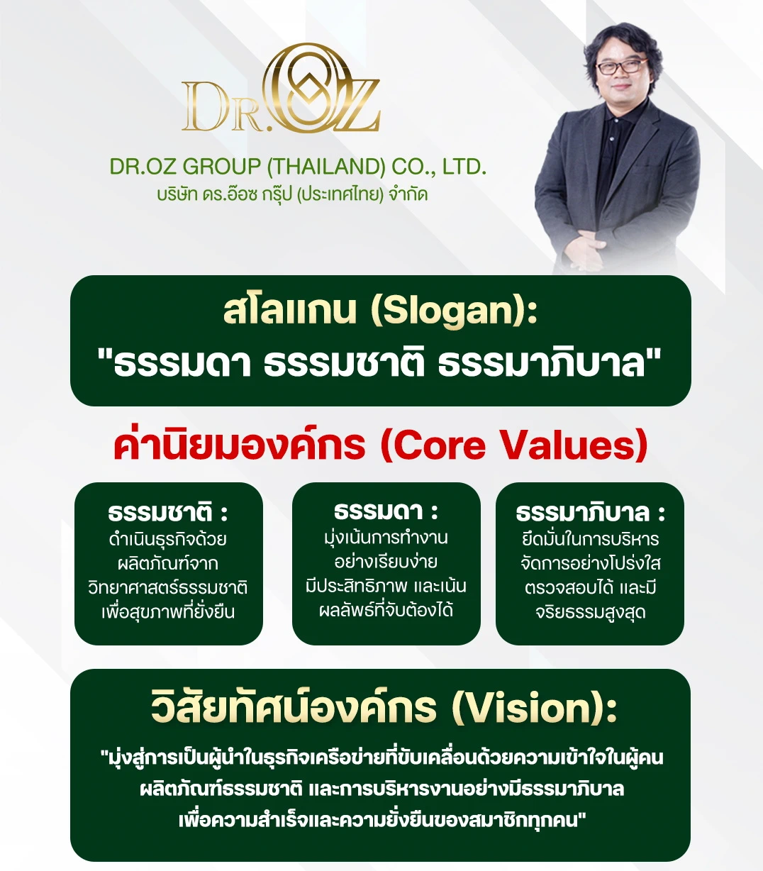 และนวัตกรรมสุขภาพกว่า 30 ปี ด้วยจุดเด่นของผลิตภัณฑ์ที่พัฒนาจากวิทยาศาสตร์ธรรมชาติ และระบบขายตรงที่โปร่งใส ยั่งยืน ทำให้ Dr.Ozz กลายเป็นหนึ่งในธุรกิจเครือข่ายสุขภาพที่ได้รับความไว้วางใจในประเทศไทย
