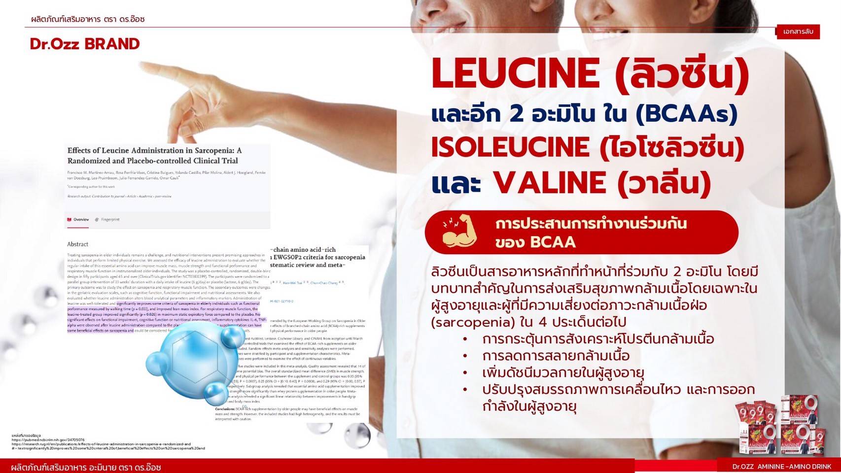 • LEUCINE (ลูซีน): หัวใจสำคัญของการกระตุ้นการสังเคราะห์โปรตีนในกล้ามเนื้อ และช่วยเพิ่มประสิทธิภาพการทำงานของตับ